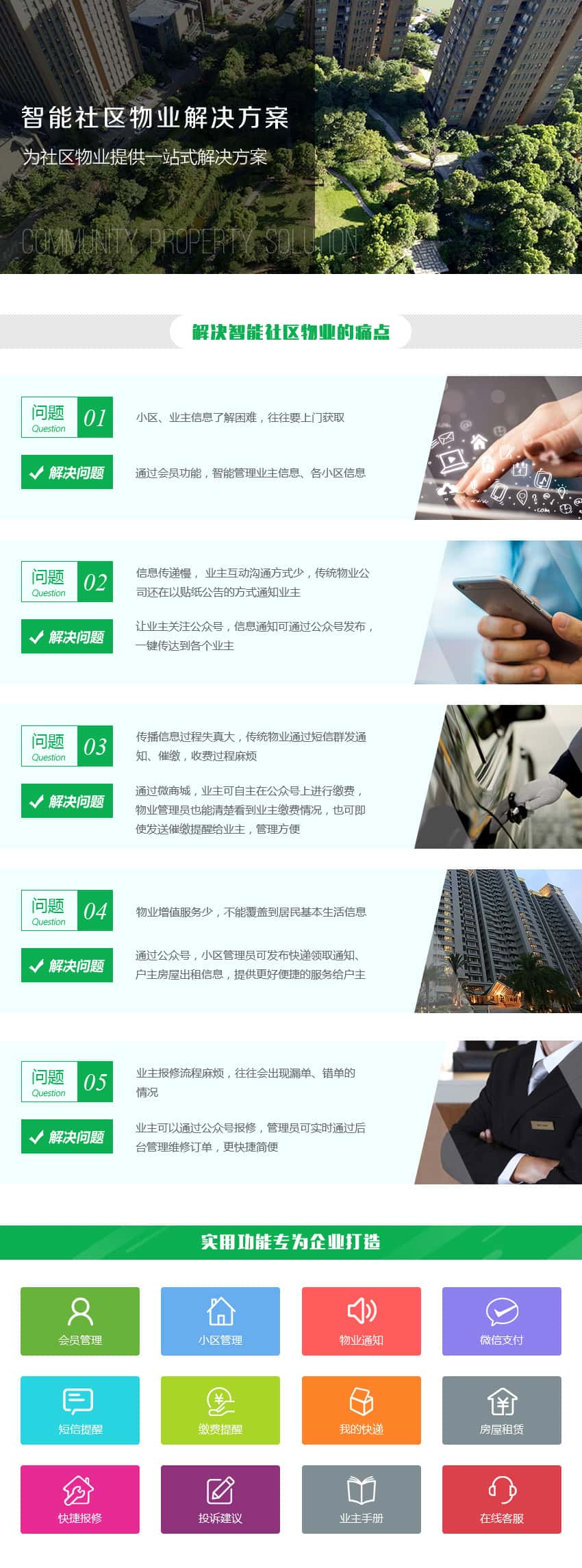 会员管理、小区管理、物业通知、微信支付、短信提醒、缴费提醒、我的快递、房屋租赁、快捷报修、投诉建议、业主手册、在线客服